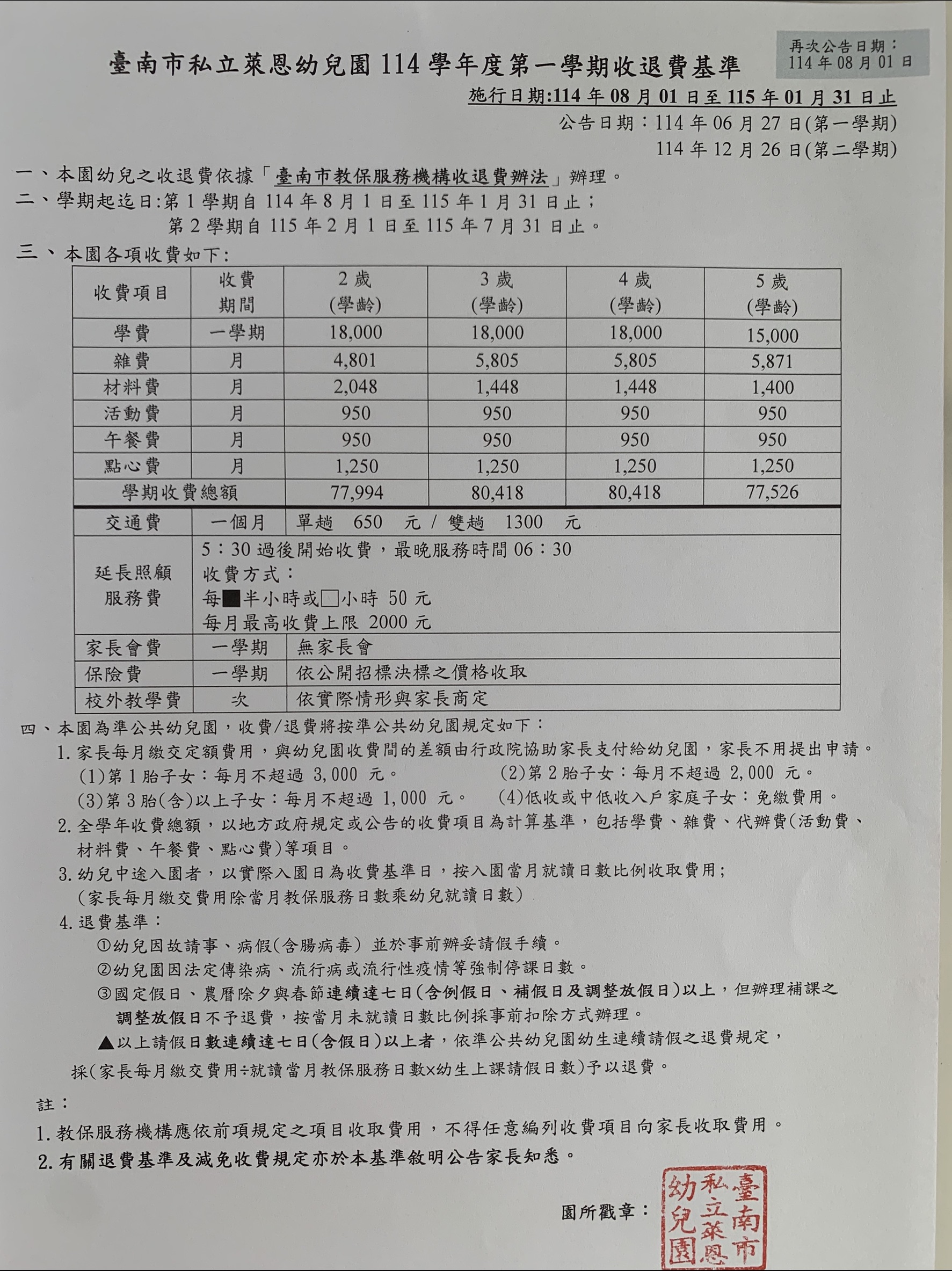 114學年度-第一學期收退費基準、收費表 、每月餐點表(點選前往)~ ~公告~▲萊恩幼兒園-門口公佈欄▲萊恩官網、電子聯絡簿~♥每月餐點表(固定公告於萊恩官網、電子聯絡簿、門口公佈欄) 家長可上網點選觀看唷~~~