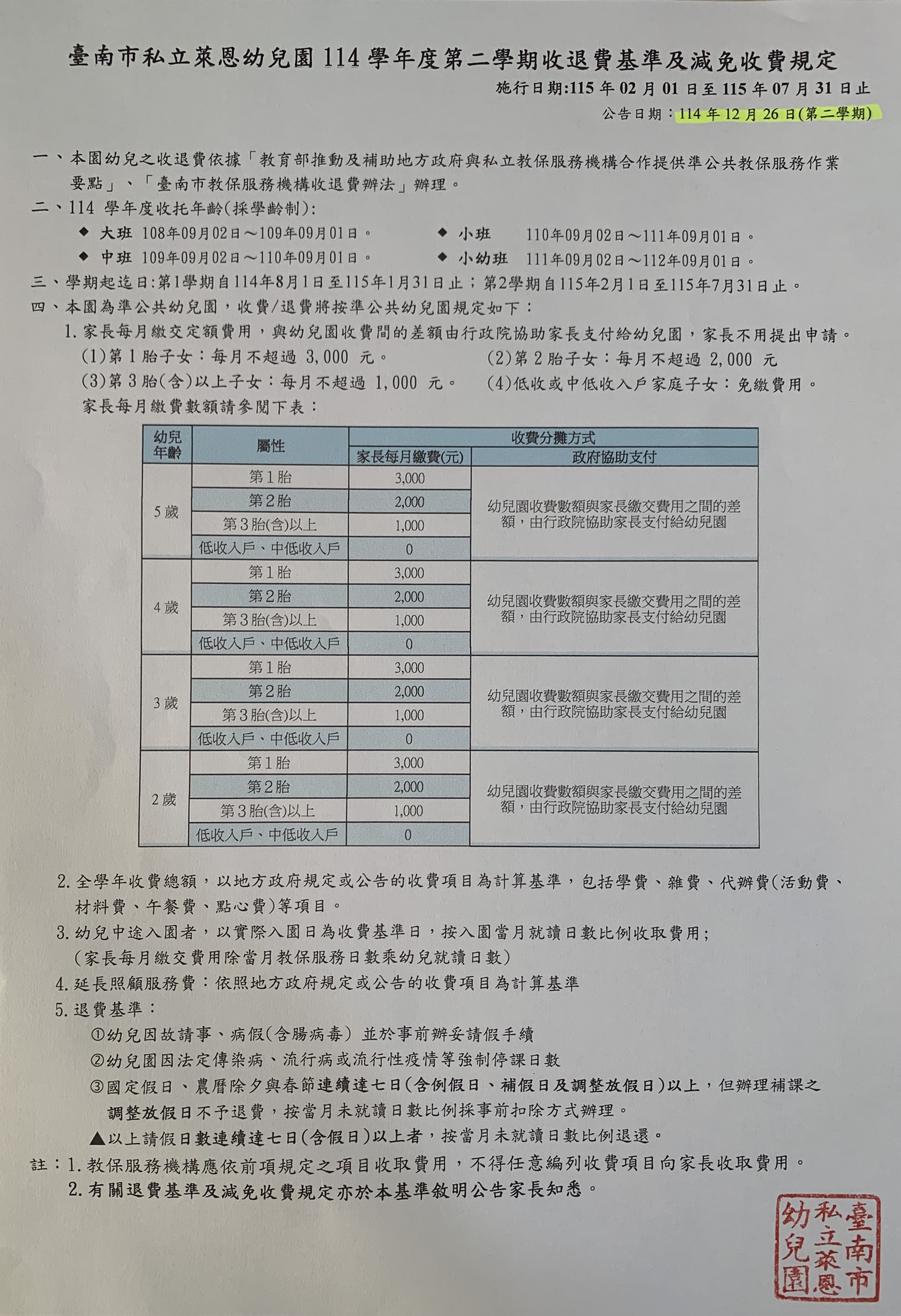▲~ 114學年度-第二學期收費表 、每月餐點表~▲♥收費表明細、收退費基準表 ~公告~▲萊恩幼兒園-門口公佈欄▲萊恩官網、電子聯絡簿~♥每月餐點表(固定公告於萊恩官網、電子聯絡簿、門口公佈欄) 家長可上網點選觀看唷~~~